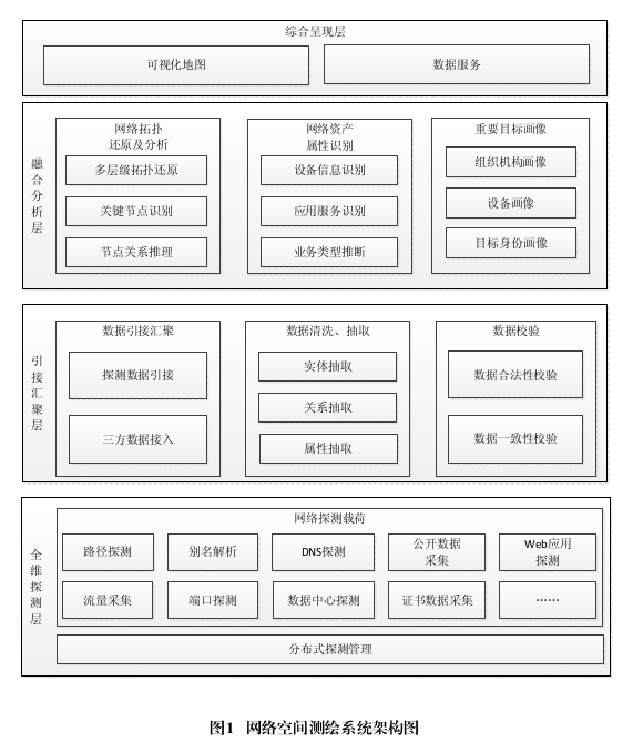 网络空间测绘系统自底向上分为全维探测层、接引汇聚层、融合分析层和综合呈现层,如图1所示。