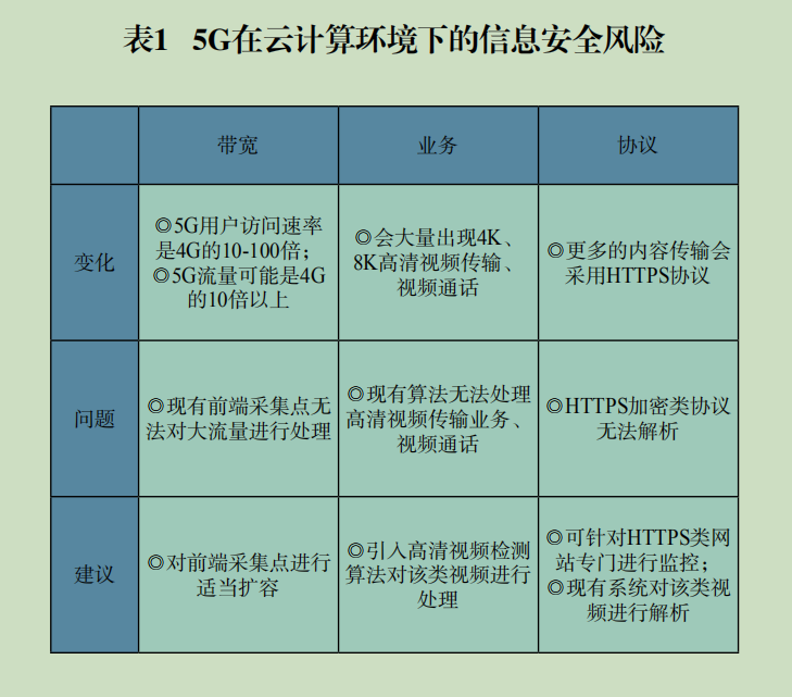 在5G网络环境下,云计算可能带来的信息安全风险参见表1。