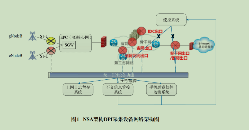 在5G NSA网络架构下,DPI采集设备的架构图参见图1,采集点包括S1-U接口、省网网间出口、省网出口、IDC出口、骨干网出口以及国际出口。